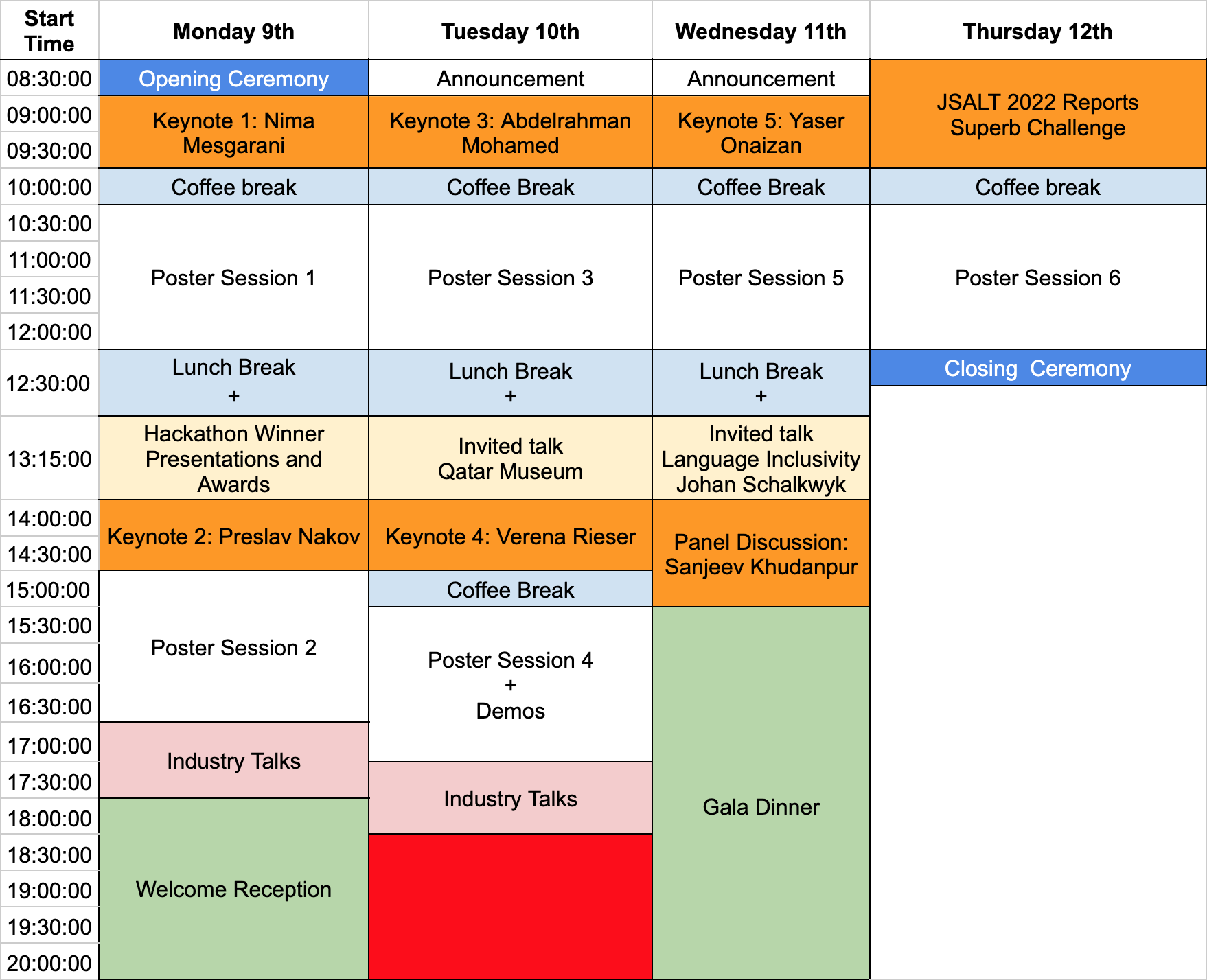 The complete schedule for the technical and social programs at SLT 2022 is as follows. the Speech Hackathon will take place 6-8 December and the technologies for the spoken languages of the world is on December 13, both are co-located with SLT 2022. Please note that posters will be on display for the entire day to facilitate discussions.